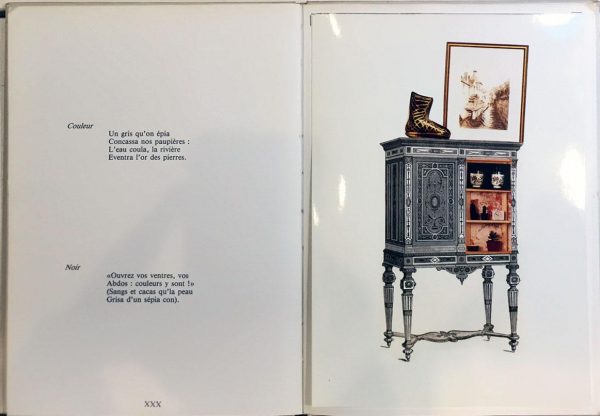 Square folio, 37.9 X 38.5 cm, (20) pages, loose, under a white cardboard cover, printed black. Inside the original blind black cardboard slipcase, 39.5 x 39 x 2.3 cm. Text in French by B. Heidsieck, artworks by E. Bal. Edition of 186 numbered and signed by the two artists in the colophon, placed at the beginnig of the book, of which 1 "hors commerce" containing the book model; 3 reserved for collaborators; 8 copies, each containing an original work by Eduard Bal, signed, a paper plane partially burnt, the fire that caused the plane to crash, under a protective transparent celluloid envelope; 4 hors commerce , each containing a fragment of the manuscript; 50 numbered 1 à 50. These first 66 copies contain 4 collages by Eduard Bal, the following 120 are numbered 51 à 170 and contain 4 silkscreens by Eduard Bal. All copies also contain a 45rpm VINYL RECORD, diameter 17 cm, Biopsie 13 Portrait-Pétales performed by Bernard Heidsieck. THIS COPY IS ONE OF THE 8 SIGNED AND NUMBERED D - K, CONTAINING AN ORIGINAL WORK SIGNED AND DATED BY E. BAL. THIS COPY, NUMBER I and A 45rpm VINYL RECORD. This book is an homage to Serge Combard, disappeared in a tourist plane that fell into the sea off Dakar in 1969. And in fact, the Bal's work, the paper airplane, mounted on a board, sinks further and further into the bottom of the board, until it practically disappears in the last board, as the pages go by, the last paper plane at the last moment before sinking completely into the sea. First edition. Condition: spine soiled and broken with occasional foxing, but covers, pages, book and slipcase in very good+, near fine condition.