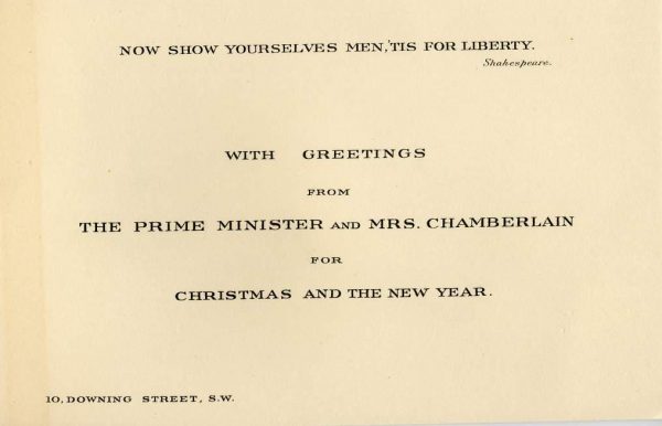 CHAMBERLAIN, (Arthur) Neville (1869-1940). The card is embossed in gilt on the front 'Christmas 1939' and is adorned with a red ribbon. Neville Chamberlain had become prime minister on 28 May 1937 at a time when the policy of appeasement was already established by the Foreign Office. He was a strong advocate of British rearmament, especially of the air force, for which purpose he raised the rate of taxation in the 1937 budget. The sequence of events leading to the outbreak of war with German on 3 September 1939 is well known to history. Anthony Eden and Winston Churchill now returned to the government and Chamberlain, although unhappy with his role as a war leader, became firmly opposed to any kind of rapprochement with Hitler without there being an end to Nazi policy.Christmas 1939 could hardly have been a happy time for Chamberlain. The strange quietness engendered by the so-called 'phoney war' came to an end on 10 May 1940 with Hitler's invasion of France. On that day Chamberlain resigned and Churchill became prime minister.1939 was Chamberlain's last Christmas. Soon after his resignation he became aware of symptoms of the abdominal problem which was confirmed as the cancer from which he was to die on 9 November 1940.- $183